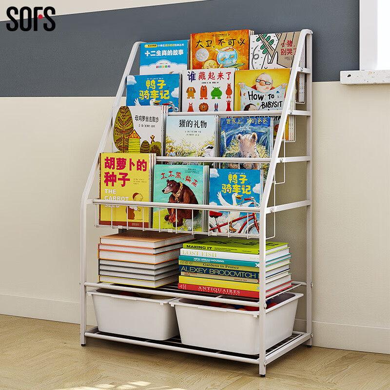 SOFS儿童书架落地绘本架宝宝铁艺小书柜简易书报杂志架书本展示置物架玩具收纳架 L码(4+2层)2盒 无轮子