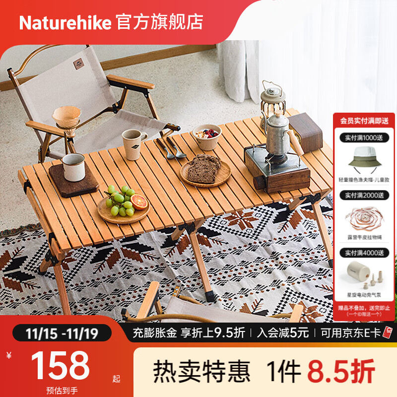Naturehike挪客星简户外蛋卷桌 折叠桌便携式露营家用实木烧烤野餐榉木野营 大号/原木色【122*60*43cm】