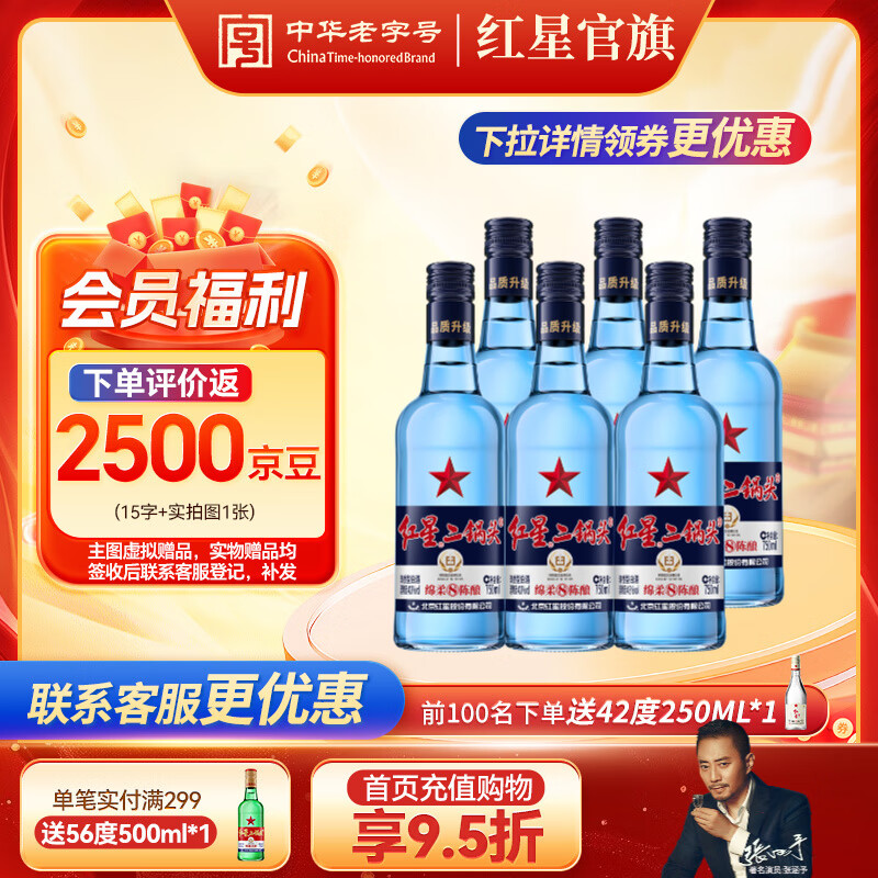 红星二锅头 蓝瓶绵柔8纯粮 清香口粮酒 红星升级甜润二锅头 节日送礼 43度 750mL 6瓶 整箱装