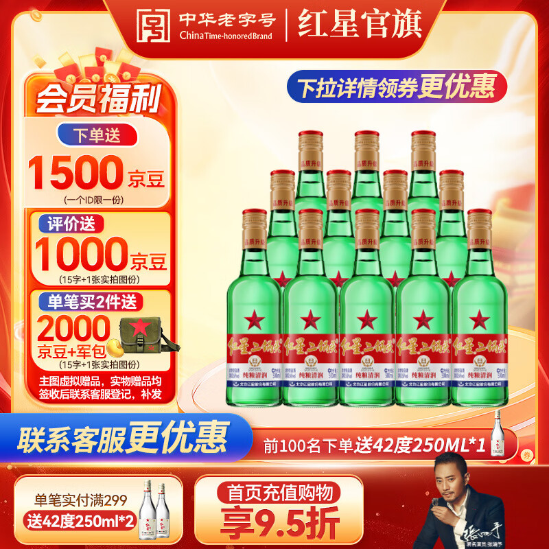红星二锅头 绿瓶大二 清香型白酒口粮酒 升级甜润二锅头 节日送礼 56度 500mL 12瓶 整箱装