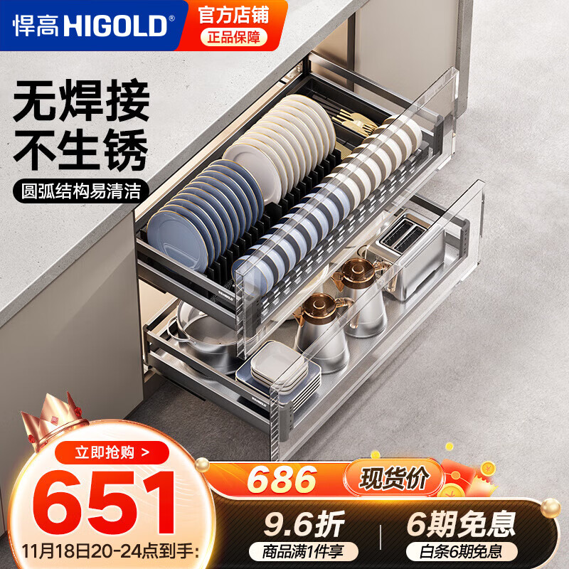 悍高(HIGOLD) 厨房橱柜拉篮碗架抽屉式碗篮加厚304不锈钢底板调味篮双层碗碟篮 800柜2层-L系列套装【京仓发】