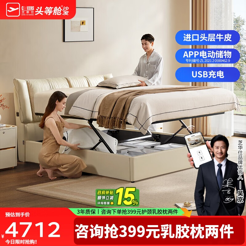 芝华仕(CHEERS)五星皮床现代简约真皮电动储物双人主卧室婚床芝华士C606G白1.8m