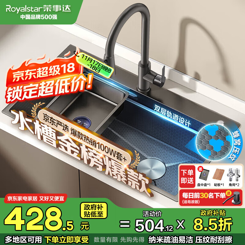 荣事达(Royalstar)水槽大单槽厨房蜂窝压纹纳米不锈钢多功能双台阶台下洗菜一体盆E1