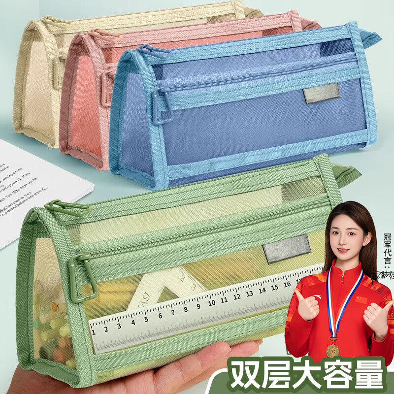 名遇透明网纱笔袋考研文具双层大容量男女孩学习文具考试专用铅笔盒简约高颜值笔袋开学必备 天空蓝