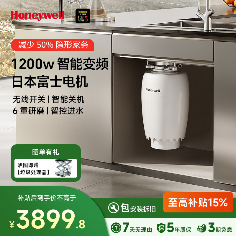 霍尼韦尔(Honeywell)家用厨房食物智能垃圾处理器1200W大功率日本富士智能变频电机X12
