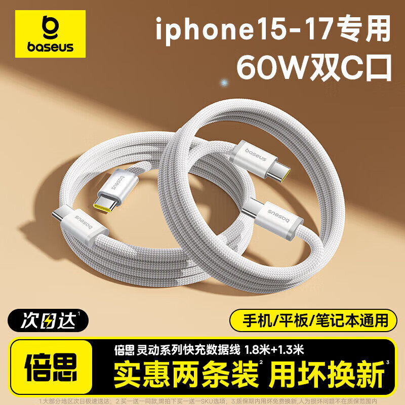倍思苹果17/16/15充电线双头type-c数据线PD60W快充线ctoc车载充电线5AiPhone17/16e/15手机2条装