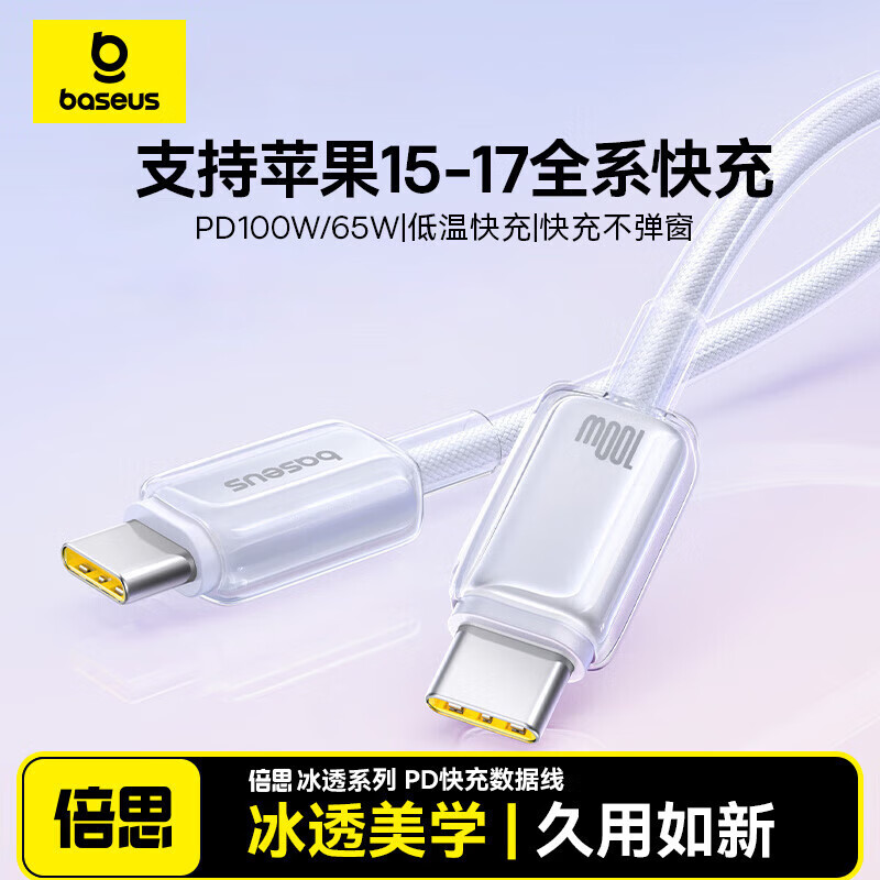 倍思苹果17/16/15充电线双type-c数据线PD100W快充ctoc车载5A适用iPhone17/16e/15Pro手机 皓月白1米