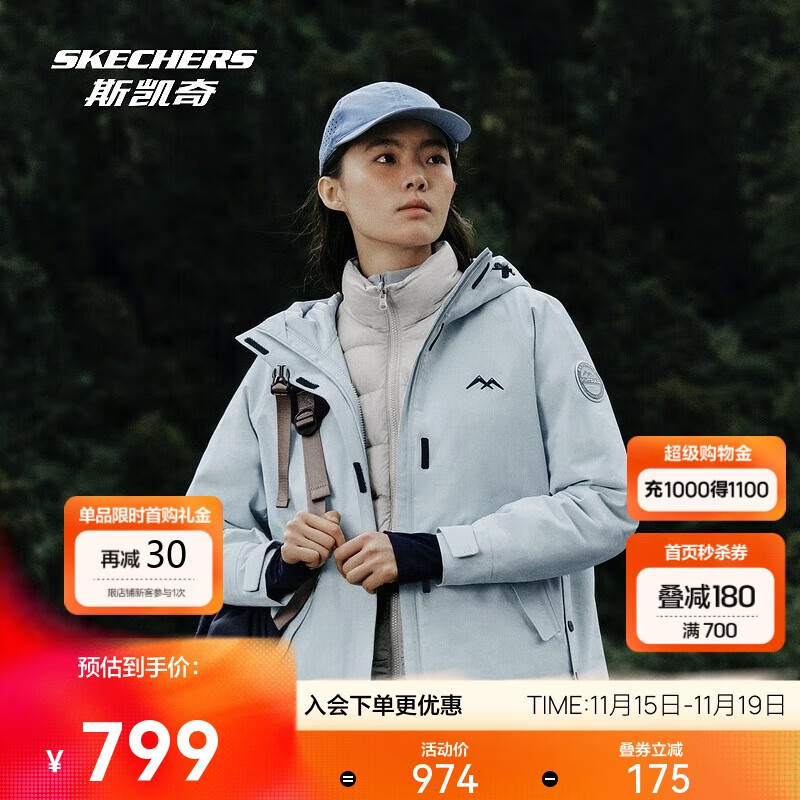 斯凯奇女秋冬季保暖登山户外干爽舒适机能三合一羽绒冲锋衣外套