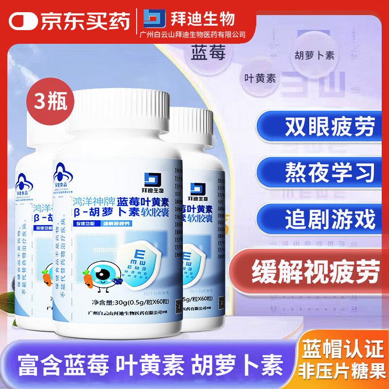 白云山叶黄素胡萝卜素胶囊60粒*3瓶成人学生青少年护眼缓解视力模糊疲劳