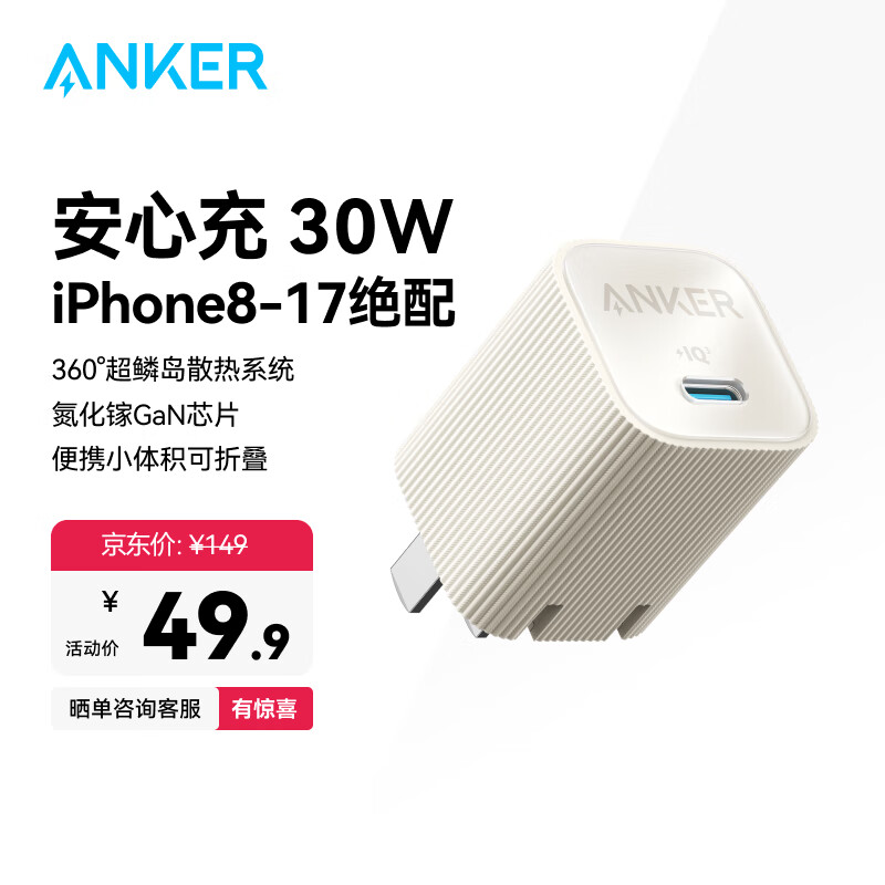 ANKER安克30W安心充17/16 type-c充电器氮化镓PD快充适用苹果17iPhone15promaxApple手机iPad插头 白