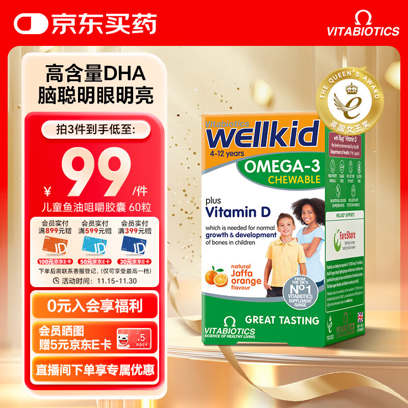 Vitabiotics薇塔贝尔儿童DHA深海鱼油咀嚼胶囊呵护眼脑健康omega3高纯度60粒