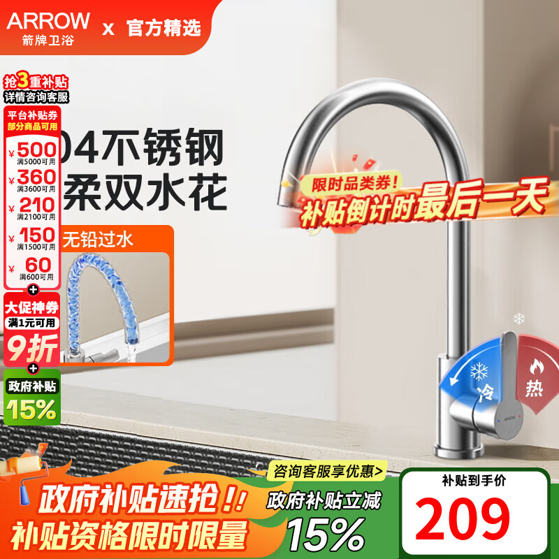 箭牌(ARROW)【政府补贴】304不锈钢锌合金精铜冷热水龙头厨房防溅龙头可旋转 冷热款|不锈钢|无铅水路-AE45160SS