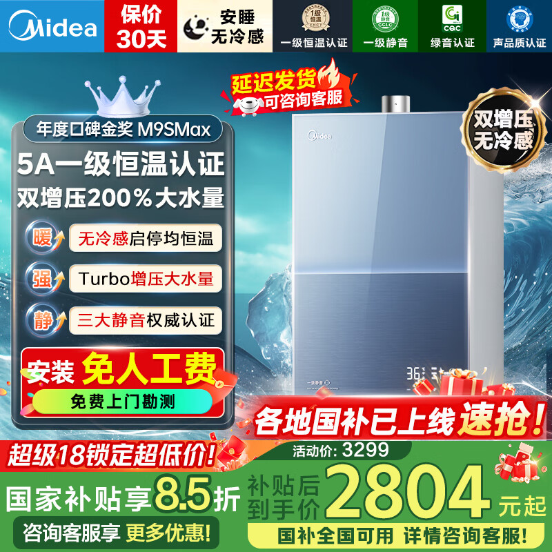 美的(Midea)家用16升燃气热水器M9SMAX天然气5A一级恒温无冷感一级静音 双增压大水量节能下置风机国补立减15% 16L 【200%双增压】M9S Max