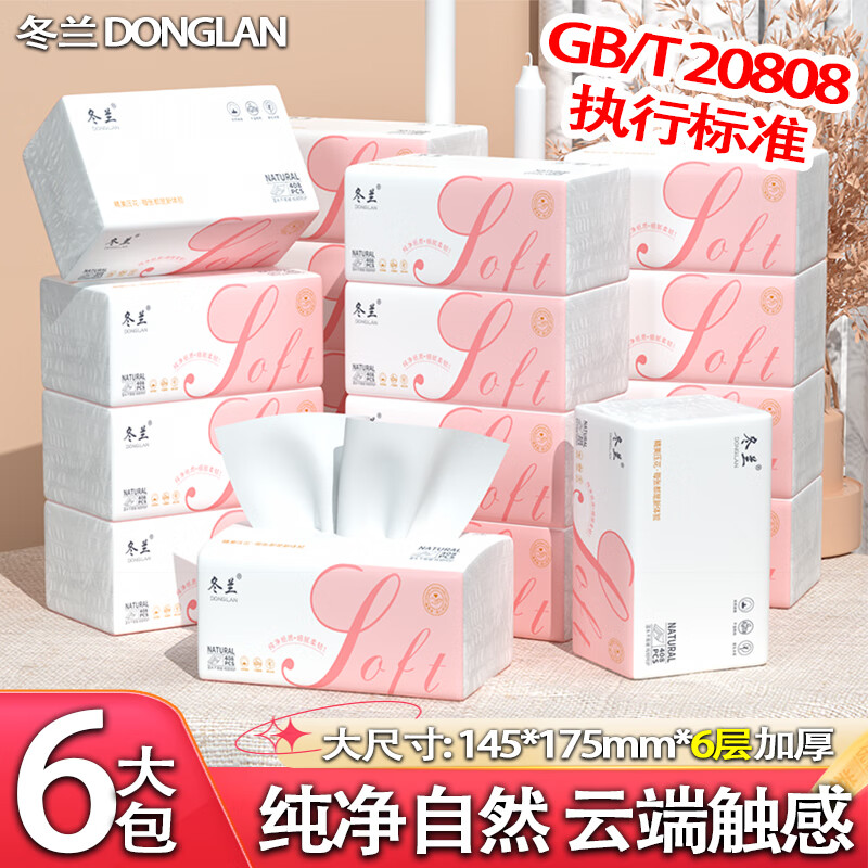 冬兰抽纸家用纸巾整箱批发纸抽大尺寸6层加厚餐巾纸家庭装柔韧面巾纸 纯净· 408张*6包 [家庭装]