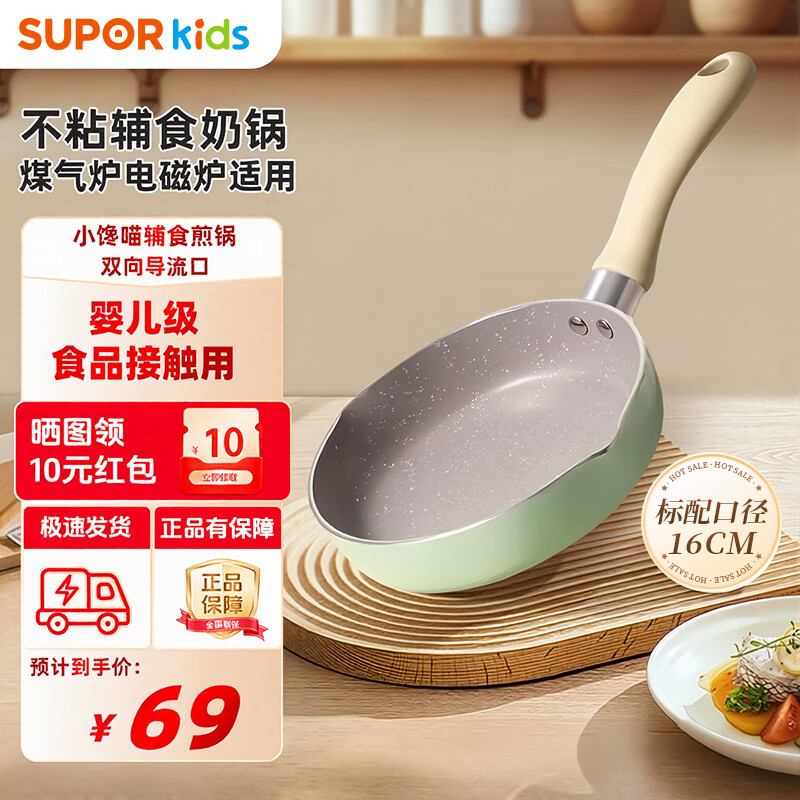 苏泊尔(SUPOR)婴儿辅食锅宝宝煎锅蒸锅奶锅不粘锅平底锅多功能幼儿专用辅食套装 薄荷绿【16cm辅食煎锅】