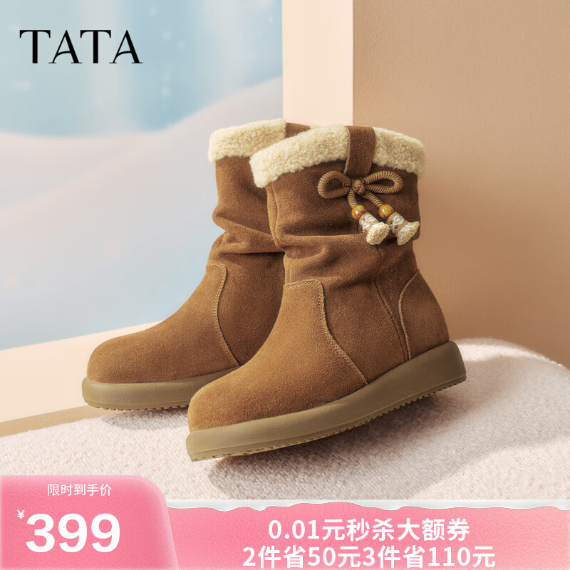 他她(TATA)雪地靴2025冬季加绒厚底休闲靴加绒西部堆堆短靴 棕黄(仿毛里) 37