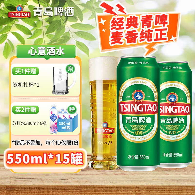 青岛啤酒(TsingTao)百年经典青啤原麦汁浓度10°P大罐加量罐装 550mL 15罐