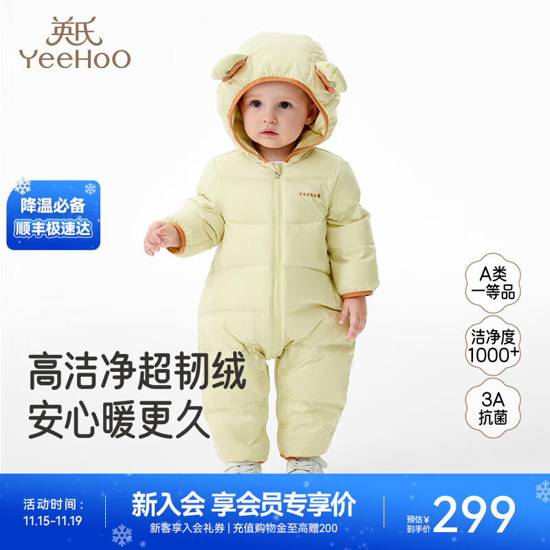 英氏(YEEHOO)婴儿连体羽绒服连帽秋冬纳米抗菌轻薄宝宝连体衣冬季超韧绒外出服 星际黄帽哈 90 cm (建议1-2岁半)