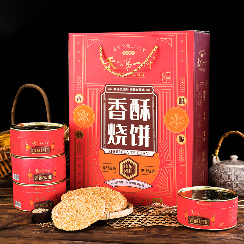 天下第一村 淄博周村香酥烧饼山东特产双味大街70gX10铁盒薄脆芝麻饼年货礼