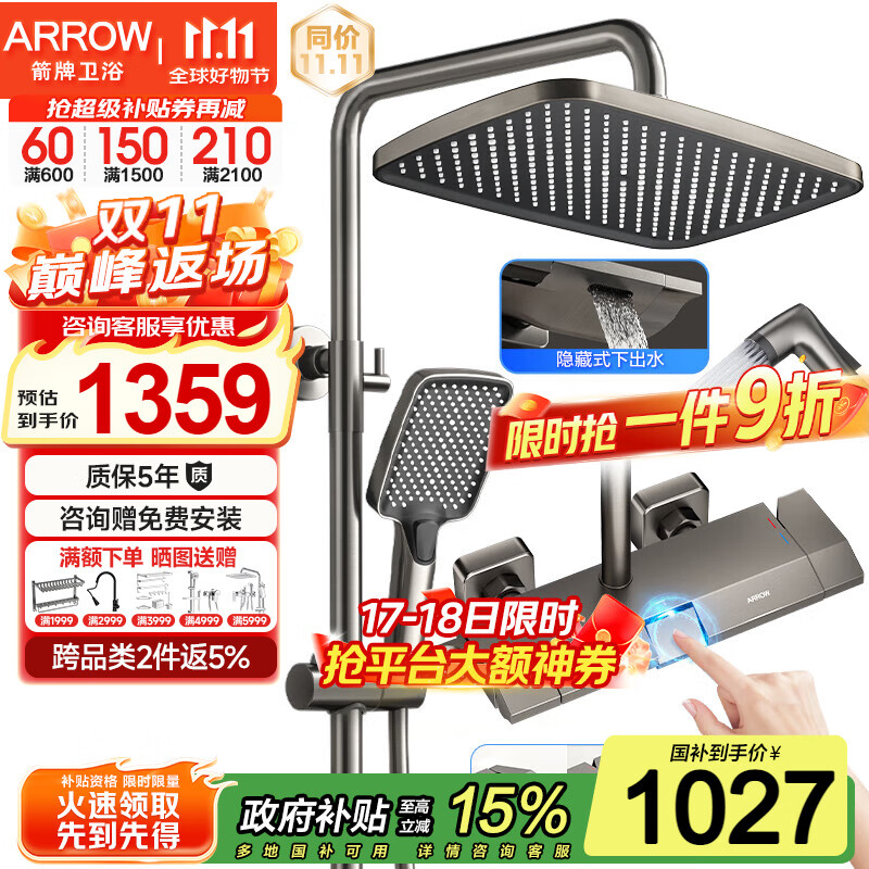 箭牌(ARROW)淋浴花洒套装 枪灰独立分水钢琴按键花洒全套花洒喷头