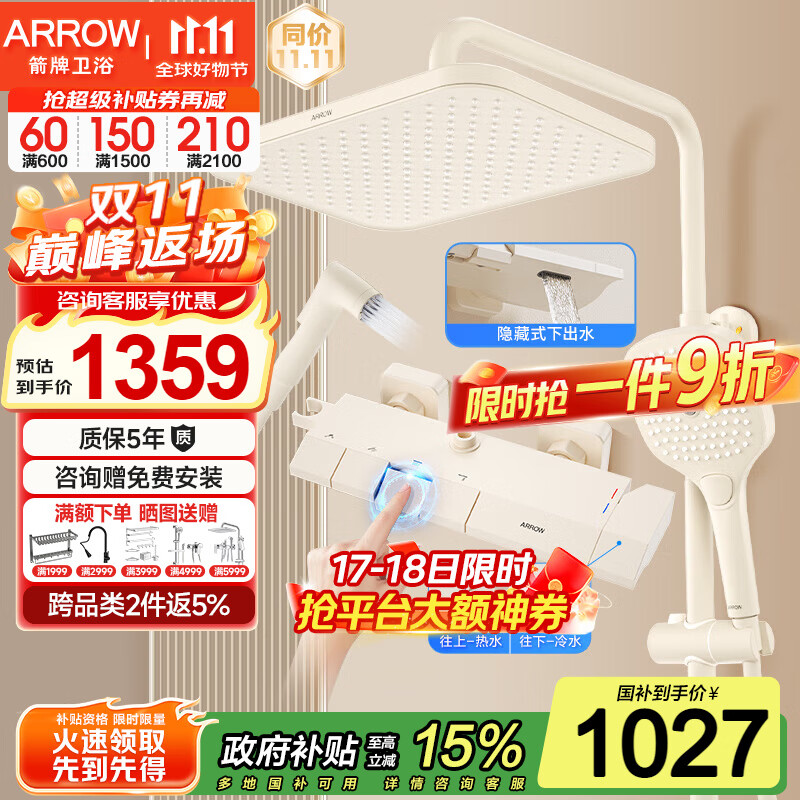 箭牌(ARROW)淋浴花洒套装 奶白钢琴按键花洒全套增压花洒喷头