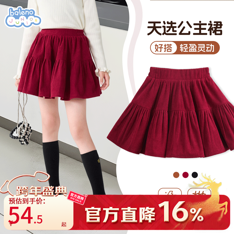 班尼路童装女童裙子春秋灯芯绒公主裙女孩百褶裙2025新款时尚半身裙短裙 【公主裙】红 160