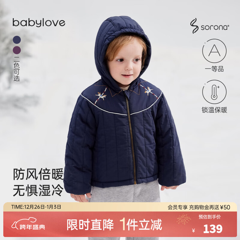 babylove宝宝夹棉防风外套冬季刺绣保暖上衣百搭加厚连帽外出棉服 星垂蓝 100