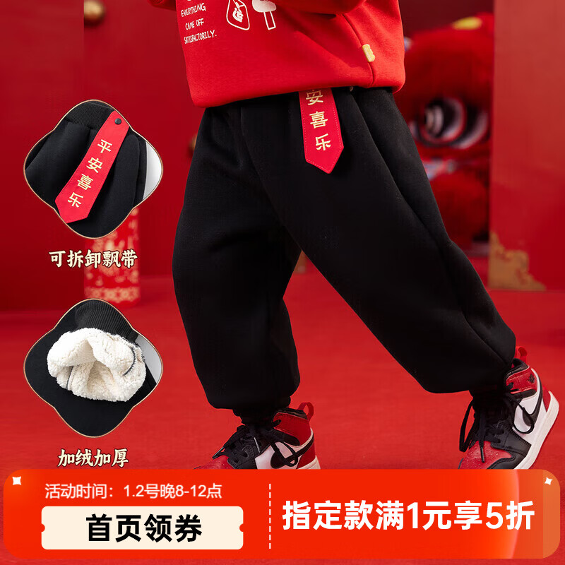 嘟嘟家【平安喜乐】宝宝年装冬季儿童拜年服男童加绒裤子女童喜庆针织裤 黑色 100