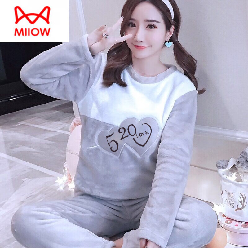 猫人(MiiOW)珊瑚绒睡衣女秋冬款可爱法兰绒保暖套装韩版新款冬季家居服可外穿 520灰 M (建议80-100斤)