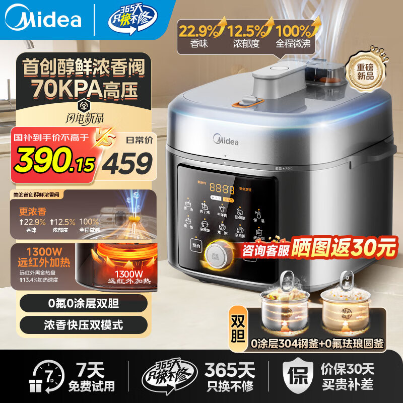美的(Midea)电压力锅 0氟0涂层电高压锅家用高压电饭锅电饭煲无涂层煮饭锅沸腾浓香双模式 70kpa高压零氟双胆 5L 【少盐提鲜 健康零氟】小飞侠系列