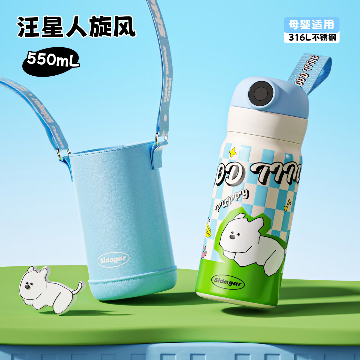 世大家儿童指纹解锁保温杯可放书包侧兜中小学生专用大容量防开盖水杯 汪星人旋风+指纹解锁+杯套