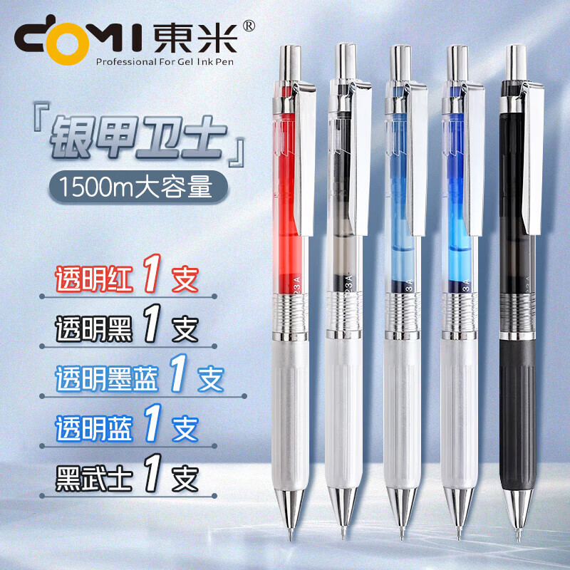 東米东米900银甲卫士 1500M大容量 5个色系 高档高品质按动中性笔 速干st笔尖 5支(每个颜色各1支)东米银甲卫士系列