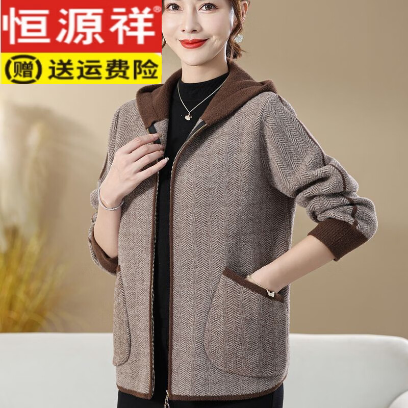 恒源祥高档25新款妈妈款春装连帽针织开衫女韩版宽松中老年女春秋毛衣女 咖啡色 3XL 【建议145斤-160斤】