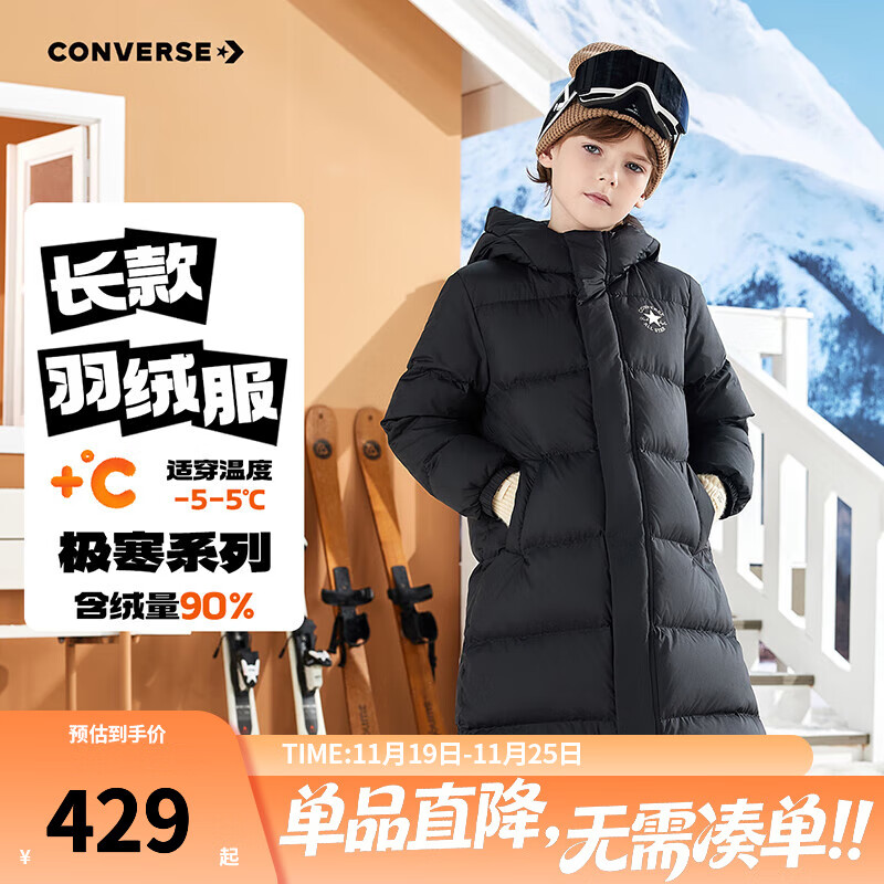 Converse匡威儿童羽绒服男女童冬季新款长款过膝中大童装极寒泡芙保暖外套 正黑色 160 充绒量约259g 【建议身高158-170cm】