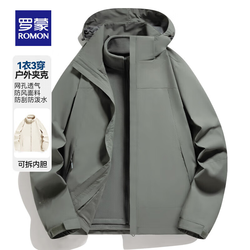 罗蒙【一衣三穿】可拆卸帽冲锋夹克抓绒内胆三合一防风外套男士休闲服 浅灰绿男 L 适合男130-145斤女125-140斤