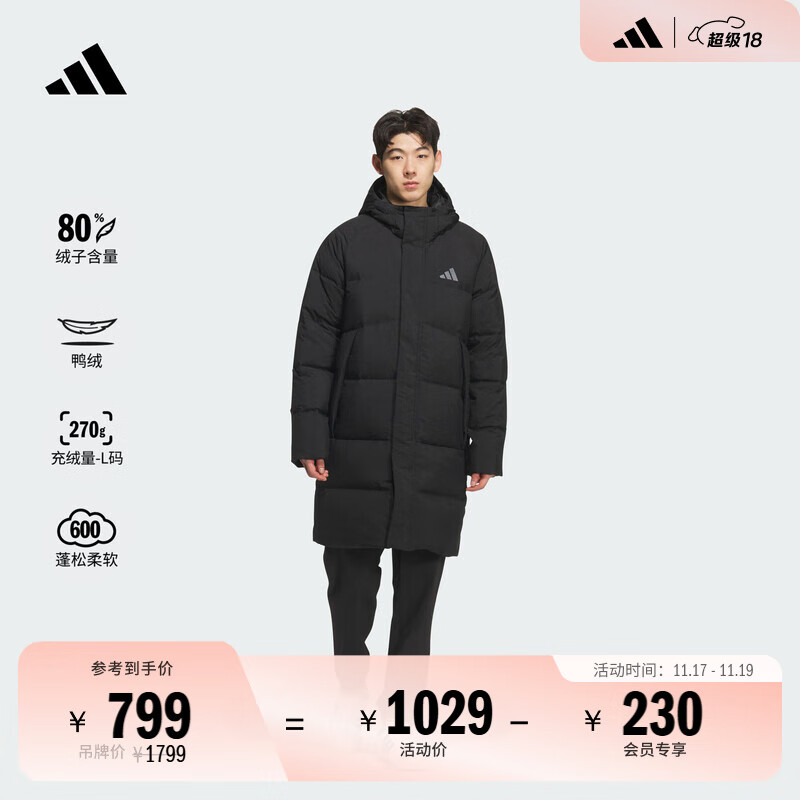 adidas 拒水暖「芯」科技长款保暖鸭绒连帽羽绒服男女阿迪达斯 黑色 M