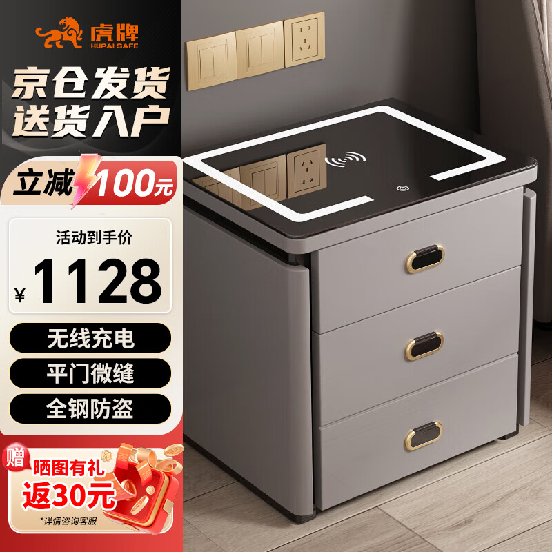 虎牌保险柜床头柜家用指纹密码保险箱一体隐藏式收纳抽屉柜全钢防盗保密柜 北尚系列 简约浅灰