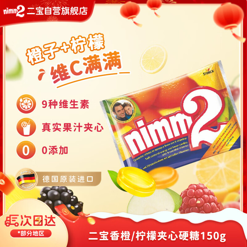 二宝(Nimm2) 维他命香橙柠檬夹心果汁硬糖145g 含9种维生素硬糖儿童零食喜糖