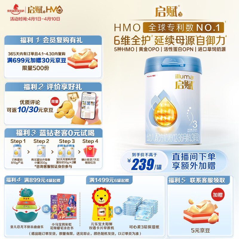 惠氏(Wyeth)启赋蓝钻【加量装】HMO幼儿配方奶粉3段(12-36月)850g 黄金OPO