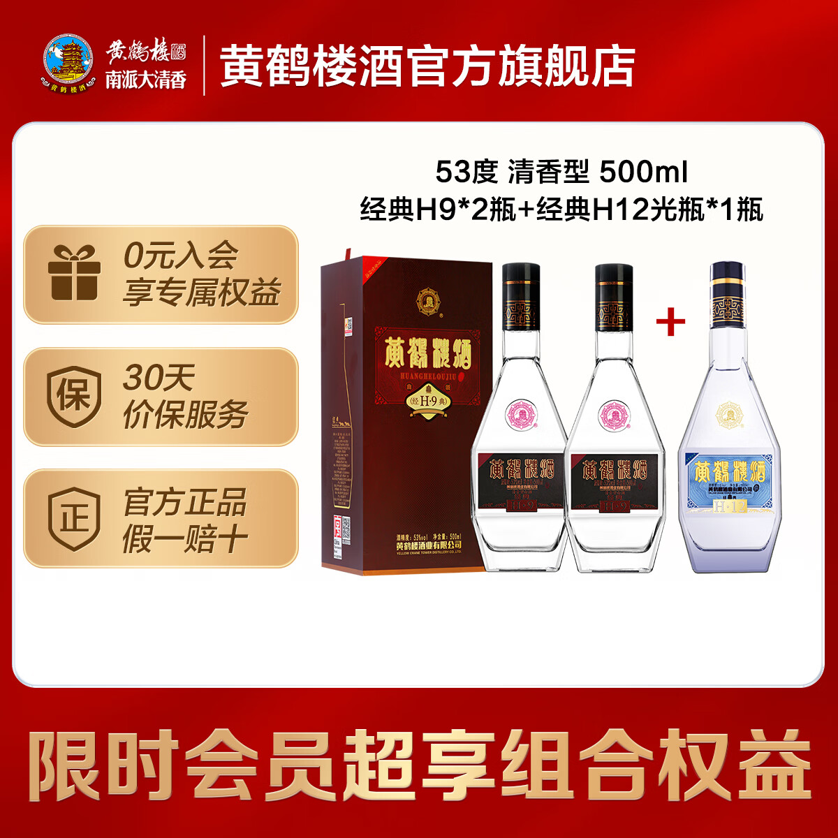 黄鹤楼酒 经典H9 53度清香型白酒 双瓶装含礼袋 纯粮酒 高粱酒宴请送礼 53度 500mL 2瓶