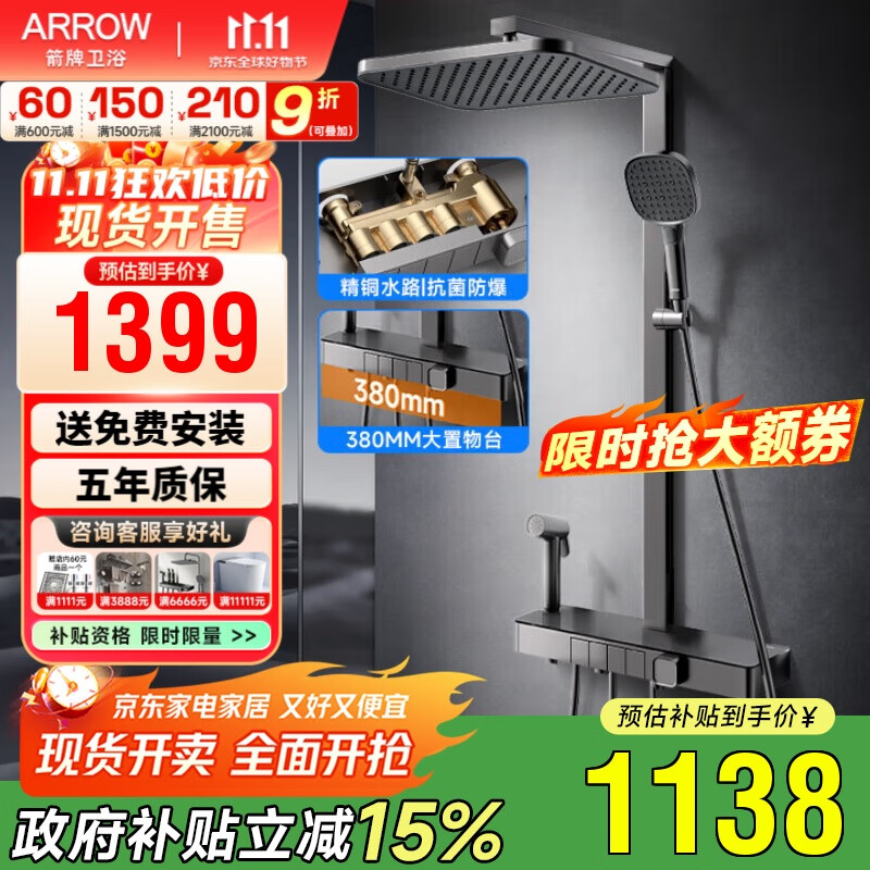 箭牌荣逸花洒淋浴方杆花洒套装 大顶喷淋浴器卫浴精铜【政府补贴15%】