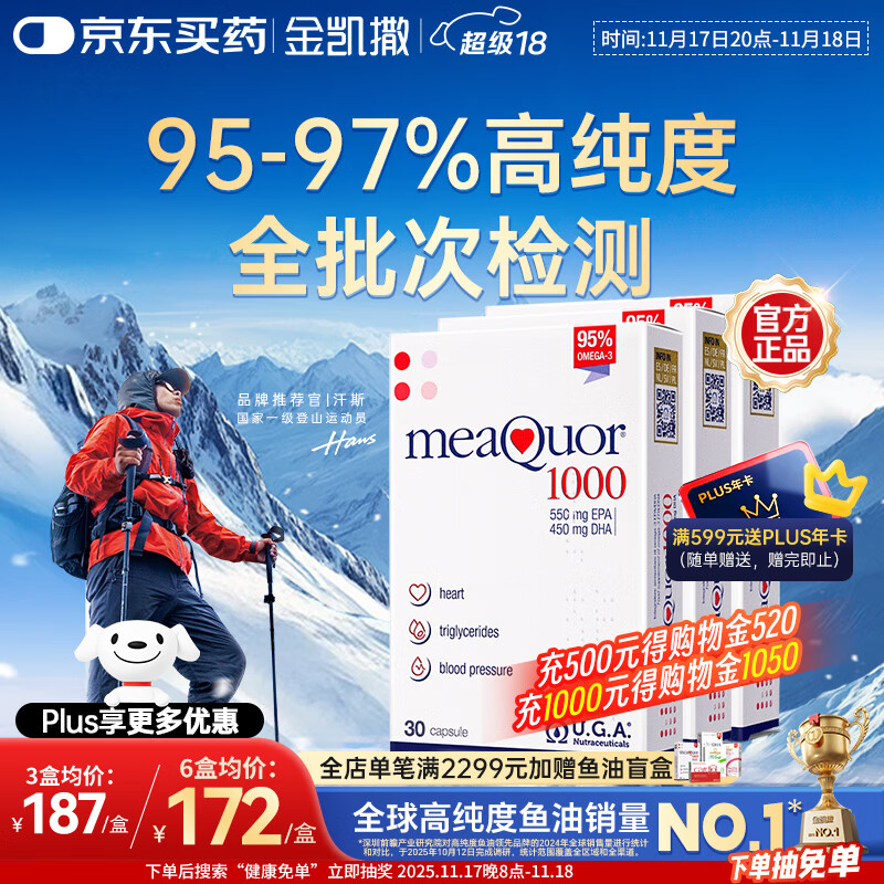 金凯撒95%~97%高纯度深海鱼油软胶囊omega-3中老成年人DHA+EPA30粒*3盒