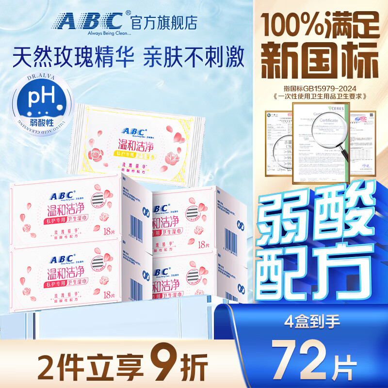 ABC私处湿巾卫生清洁抑菌湿巾PH弱酸18片/盒*4盒(KMS免洗配方)