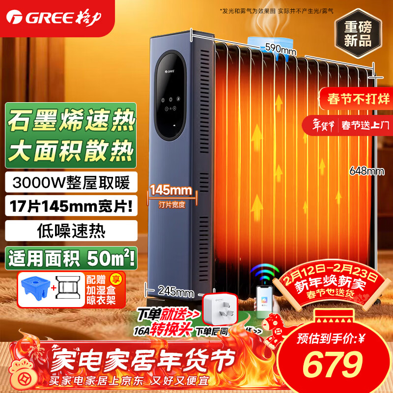 格力(GREE)石墨烯取暖器17片电油汀家用全屋取暖电暖气片立式卧室客厅落地节能电暖器WIFI遥控 NY23-S7130B