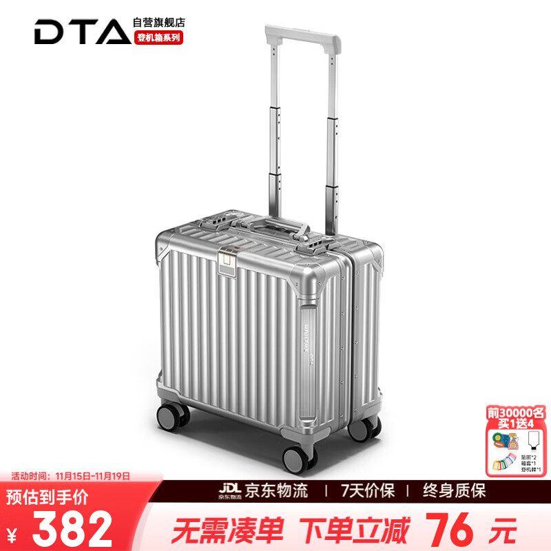 DTA多功能行李箱男女万向轮铝框登机拉杆箱旅行皮箱子尊贵银18英寸