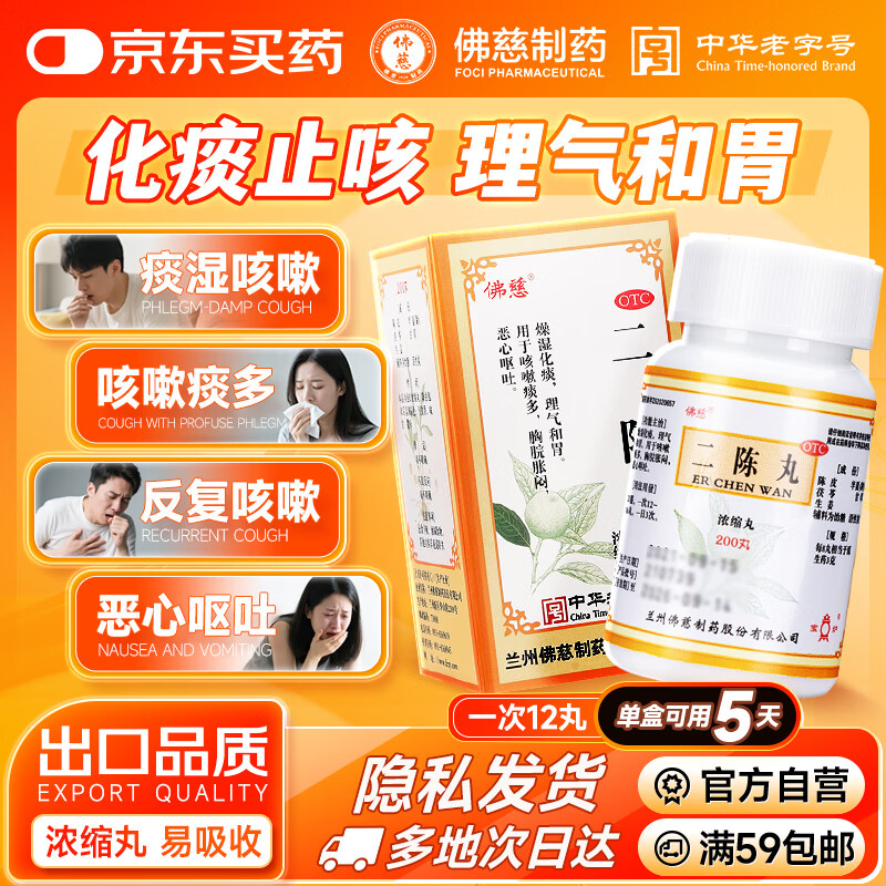 【常备安心】佛慈 二陈丸(浓缩丸)200丸 止咳祛痰燥湿化痰理气和胃恶心呕吐咳嗽痰多胸脘胀闷止咳药