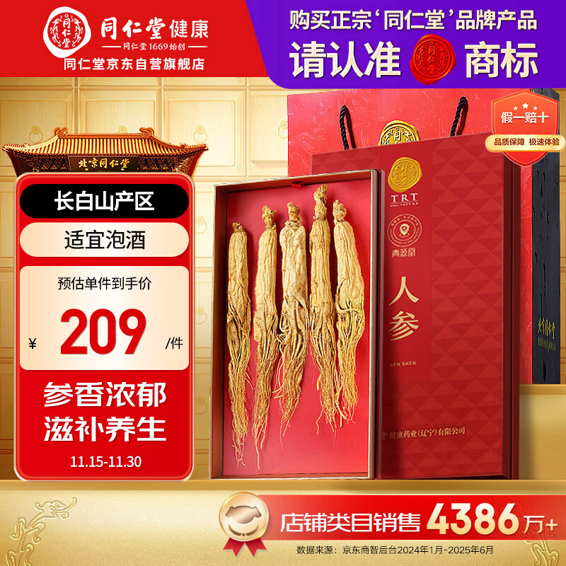 同仁堂品牌北京同仁堂人参礼盒5支正宗长白山人参泡酒送父母长辈
