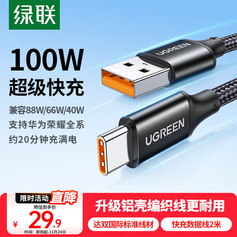 绿联Type-C数据线6A适用华为荣耀超级快充100W/66W充电线Pura80/70/Mate70/60Pro+小米安卓手机车载2米