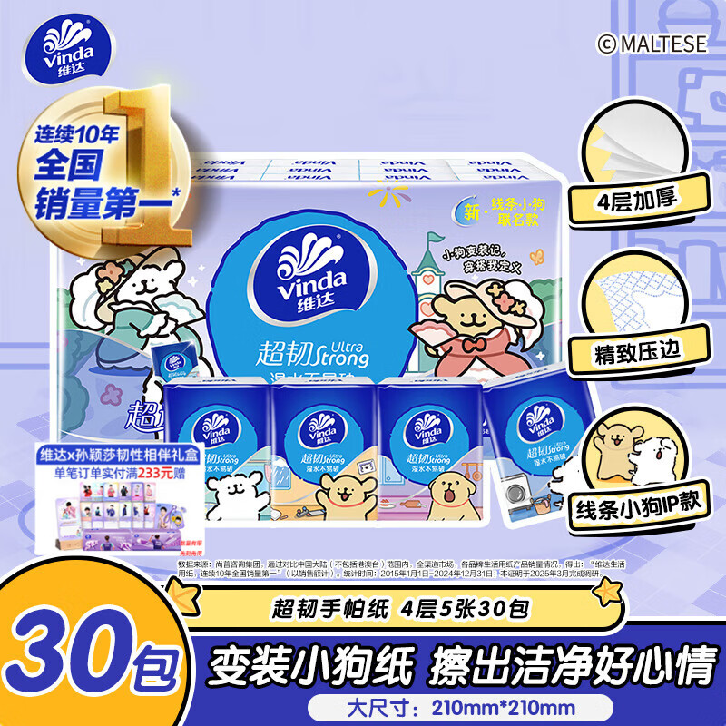 维达(Vinda)超韧手帕纸4层5张*30包 纸巾小包 线条小狗IP款 出行便携装