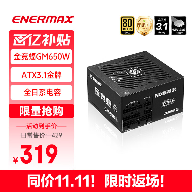 安耐美(Enermax)电源650W 金竞蝠GM650W黑色 ATX3.1电源 金牌全模 全日系电容/FDB风扇/五年保固